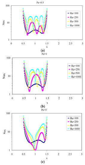 Variation of local Nusselt number along the channel (c = 0.33), (a) Pe = 0.5, (b) Pe = 1, (c) Pe = 5.