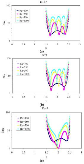 Variation of local Nusselt number along the channel (c = 0.66), (a) Pe = 0.5, (b) Pe = 1, (c) Pe = 5.