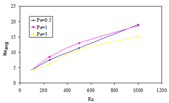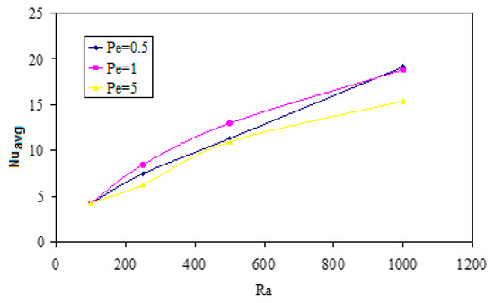 In Figure 9, it is indicated that the average number of Nu changes with the Ra number for different Pe numbers in the case that the heat source is close to the up-stream. The average Nusselt number increases almost linearly as the Rayleigh number increases. A nearly linear increase has been observed due to the conductive heat transfer being dominant in the low Ra numbers.