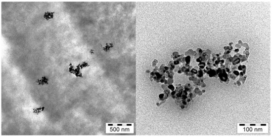 Transmission electron microscopy (TEM) images of an AgNPs-nanocomposite.