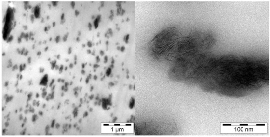 Laponite is a synthetic colloidal layered silicate which is composed of disc-shaped crystals in the nanoscale size region. In recent studies it was shown that the physicochemical polymer properties of biopolymers based on pectin [6] and cellulose ethers [7] could be enhanced by the incorporation of laponite. Laponite crystals are of approx. 1 nm in thickness and have diameters of approx. 25 nm. Thus, the primary structure (i.e., the disc-shaped crystals) is significant smaller than it is in naturally occurring clay minerals, like bentonite, and for this reason laponite exhibits a higher potential to be released from a polymer matrix than other clay minerals. A visualization of the laponite particles as present in the used nanocomposite is given in Figure 3. The platelets within the laponite stack are rather oriented randomly than parallel to each other. At the border region of the Laponite aggregates single platelets can be found. Typical aggregates found in the laponite-nanocomposites exhibit diameter of approx. 50–200 nm whilst single laponite platelets show diameters of approx. 20–30 nm with a thickness of 1 nm.