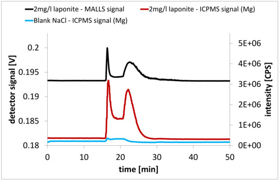 Comparison between AF4/MALLS and AF4/ICPMS measurements of a 2 mg/L laponite dispersion. Black is the signal recorded by the MALLS detector (caused by laponite particles) and red is the signal of the ICP-MS for Mg at identical elution times. Blue is the signal for Mg of the NaCl in 3% HNO3 blank (shifted by −1.5 × 105 CPS for better differentiation).