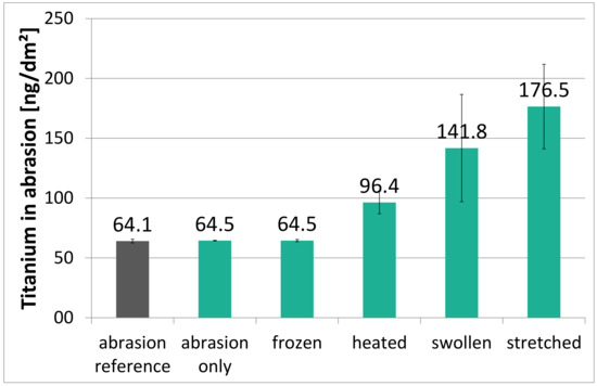Compared to the reference samples without TiN in the polymer the other test samples that were additionally stressed caused a relative higher release of titanium of approx. 0.03 µg/dm2 (heating), 0.08 µg/dm2 (swelling) and 0.11 µg/dm2 (stretching).