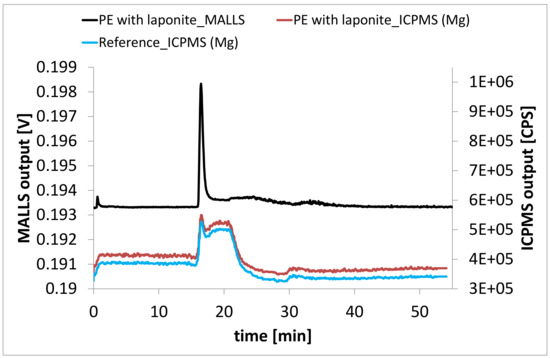 Injections of samples prepared from the abrasion of samples that were stretched previously and then abraded by the dry food simulant showed a slight signal via MALLS detection at elution times relevant for laponite particles as well (Figure 9, black fractogram). To differentiate between laponite particles and other contaminants these samples were analyzed by AF4/ICP-MS, too. Again, the identical sample that caused a signal via MALLS detection did not cause a signal for Mg when measured by AF4/ICP-MS (Figure 9, red fractogram). With a signal in the AF4/MALLS fractogram only, but no signal for Mg in the AF4/ICP-MS fractogram the presence of laponite particles can be excluded.