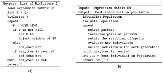 SMOB adopts a sequential covering strategy, as depicted in Figure 1a. A MOEA (whose scheme is reported in Figure 1b) is called n times, and each time a bicluster is returned. The returned bicluster is stored in a list L that contains all the biclusters found so far. To avoid overlapping among biclusters, we associated a weight with each element of the expression matrix. These weights are adjusted right after a bicluster is returned. is equal to the number of biclusters stored in L that contain . When evaluating a bicluster, the weights of its elements are used in order to penalize biclusters overlapping with elements of L, as it explained in the following. Notice that the sequential coverage strategy adopted is such that the order in which biclusters are discovered does not reflect their quality nor their relevance.