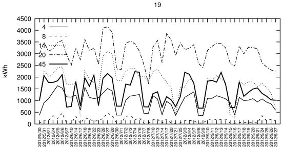 For example, considering Bicluster 19 depicted in Figure 3, we can notice that on 7–8 July, which was a weekend, the consumption of Building 20 decreased to the levels of Building 11 ( kWh). This is odd, since in Buildings 20 there are many biological laboratories, which need constant energy to, for example, maintain the temperature. In contrast, in Building 11 there are only offices and classrooms, which on a Saturday should not consume much energy. Moreover, on the day after, a Sunday, the consumption of Building 11 was higher than that of Building 20. This fact represent an abnormal consumption for Building 20 since the average consumption during weekends in July through the years is kWh, which is significantly higher than the consumption depicted in the bicluster. Moreover, on 14 July, a Sunday, we can see that the consumption of Building 11 was lower than that of building 20, which is the expected behaviour and can be found again on 21 July, which was a Saturday.