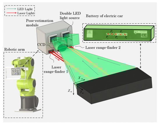 Figure 1, the pose-estimation module is mounted onto the robot manipulator, composed of one calibrated camera, a pair of high brightness LED light source, and two laser rangefinders. The LED light provides a bright and clear view of the battery for the Charge Coupled Device (CCD)camera to capture the image, and the data is then sent to the computer server for pose estimation. The keypoint