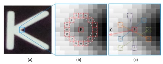 Figure 4b is a candidate keypoint, surrounded by a circle of sixteen points. The FAST determines whether the point F can be a keypoint by the following equation: