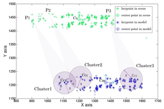Cm can be easily obtained. For every keypoint in the scene image, it is important to determine the corresponding searching cluster in the reference image to narrow the search area. The searching area is restricted to a circle area with radius of