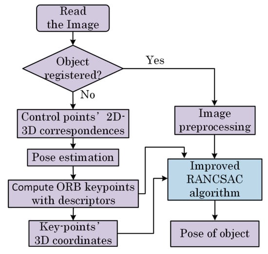 The descriptors and 2D–3D corresponding coordinates of the keypoints are obtained when the reference image is registered. For the pose-estimation step, the ORB features and descriptors in the input scene image are computed first, then the pose of the object can be estimated using the improved RANSAC method.