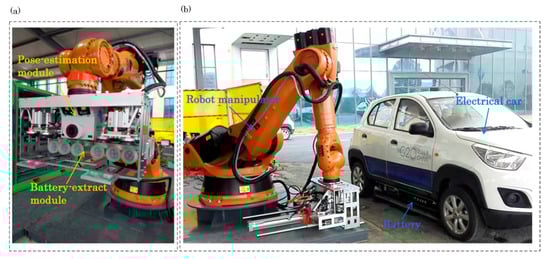 Figure 9, the automatic battery-replacement system was composed of the pose-estimation module, battery-extract module, and the robot manipulator. The electric automobile pulls over in the restricted parking spot, in front of the KUKA robot manipulator, then the image of the battery is captured by the camera. Meanwhile the laser rangefinder provides the real-time distance away from the car. The suction cups of the battery-extract module will take out the battery when the robot arm receives the pose information of the battery.