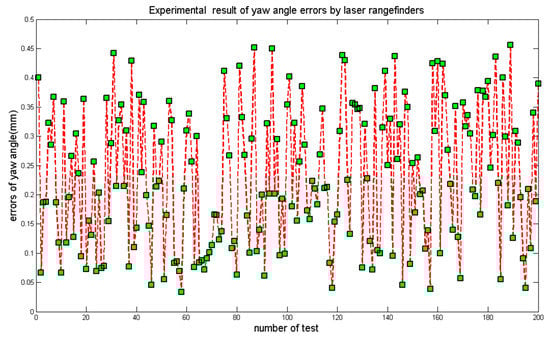Figure 11, it was not reliable enough with errors of ±1°. Therefore, we used laser rangefinders to detect the yaw angle. The experimental result of yaw angle errors is shown in