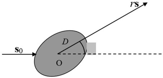 Scattering problem geometry. and represent the incident and scattering directions, respectively. is the scattering angle, and D is the domain the scatterer occupies.