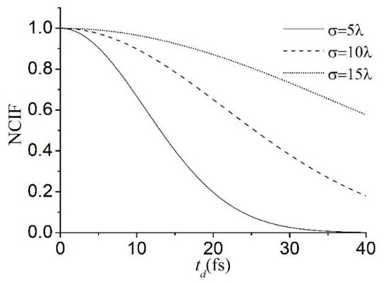 The NCIF of the scattered partially coherent Gaussian Schell-model plane-wave pulse versus for different values of and of the quasi-homogeneous random medium with .