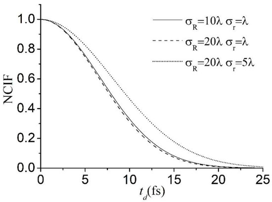 where , , and are positive constants with . The function varies much more slowly with than the function varies with . It follows from Equations (7), (10), (13), (14), and (18) that the average intensity and the NCIF of the scattered field are given by the expressions: