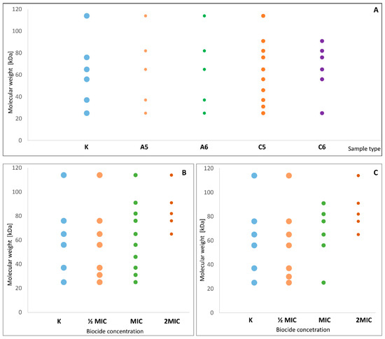 (A) Effect of neutral (A5 and A6) and cationic (C5 and C6) gemini surfactants on extracellular protein profiles of A. brasiliensis ATCC 16404 at MIC; changes in protein profiles after (B) C5 and (C) C6 treatment at ½ MIC, MIC, and 2 MIC in comparison with the sample without biocide (K). The sizes of the bubbles are related to pixel intensities in the protein profile patterns.