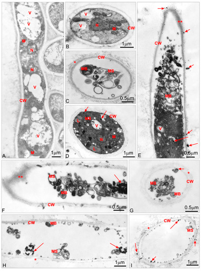 (A,E,F,H) TEM micrographs of longitudinal-sections and (B–D,G,I) cross-sections of Aspergillus brasiliensis: (A,B) control hyphae; (C–E) hyphae treated with hexamethylene-1,6-bis-(N,N-dimethyl-N-dodecylammonium bromide) C6 for 48 h at 0.5 MIC; (F,G) hyphae treated with C6 for 48 h at MIC and (H,I) hyphae treated with C6 for 48 h at 2 MIC. CW—cell wall; L—lipid; M—mitochondrion; MB—multivesicular body; MS—membranous structure; N—nucleus; V—vacuole; arrows-electron-dense deposit.