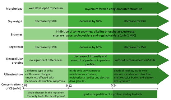 Prior to studies using a transmission microscope, the cultures were prepared using the same method as for enzymatic studies. After 48 h of treatment with hexamethylene-1,6-bis-(N,N-dimethyl-N-dodecylammonium bromide) (C6) at concentrations of ½ MIC, MIC, or 2 MIC, the mycelia were separated from the medium by filtration. A mycelium that had not been treated with biocide was used as a control sample.