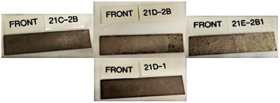 Figure 2. PNNL foils 21C-2B and 21D-1 appeared relatively uniform and had consistent surface finish, while foil 21D-2B appears to have some surface discoloration on the right end. Foil 21E-2B1 had obvious Zr blisters on the left end and some discoloration on the right end. There are no known documentation or photos prior to HIP of the plasma sprayed Zr foil pieces that were supplied by LANL.
