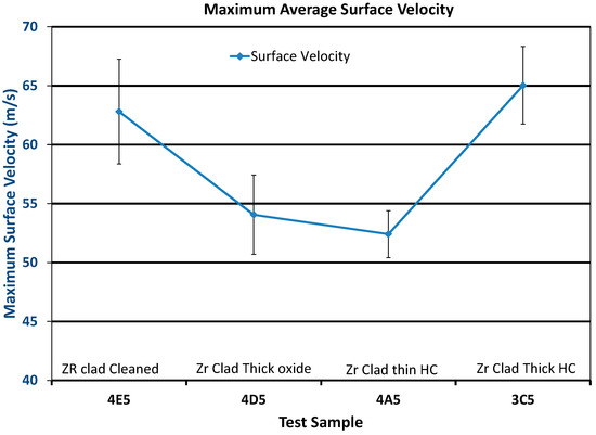 Figure 7 shows the resulting maximum surface velocities obtained for the LANL variable contamination specimens. The reference specimen is 4E5 with the Zr coating that was cleaned using typical procedures prior to HIPing. The contaminated samples 4D5 and 4A5 show some interface strength degradation, which might be expected. Sample 3C5 with a thick hydrocarbon layer shows a slight increase in interface strength with respect to reference specimen 4E5. These results also suggest that surface preparation has minimal effect on bond strength. Although the increase in the interface strength is not statistically significant, it is interesting to note that the bulge testing performed at LANL on specimens taken from the same fuel plates also shows the thick hydrocarbon sample having the highest interface fracture energy [