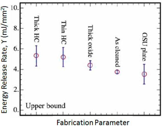 Results from bulge testing performed at LANL indicating that contaminated plates resulted in higher interfacial fracture energy compared to the plate made using the typical cleaning process [