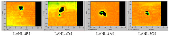 Representative images of the colorized debond locations in LANL plates caused by laser shock testing are shown. Note: The images are not to scale.