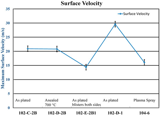 Figure 10 shows that the maximum back-surface velocity for the plated and plasma coatings ranges from 15 to 30 m/s, while the co-rolled plates have a range from 53 to 65 m/s as shown in