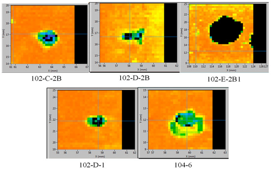 Figure 11. The atypical specimen is plate 102-E-2B1 that contains the foil that had obvious Zr coating blisters and discoloration in the as-received condition. The debond area for 102-E-2B1 has a diameter close to 8 mm, which is significantly larger than the incident shock laser spot size. As expected, plate 102-E-2B1 also exhibited the weakest fuel–cladding interface. The plasma sprayed foil in plate 104-6 also exhibited a weak interface, showing a bond strength comparable to that observed for blistered Zr coated electroplated foil in plate 102-E2B1.