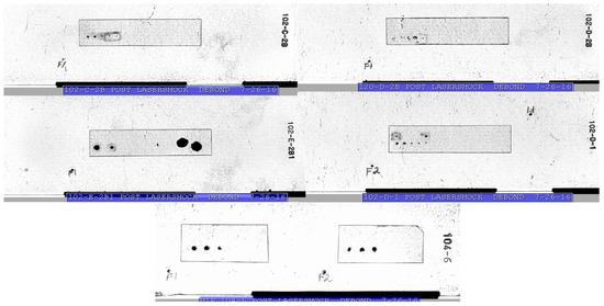 Ultrasonic C-scan images depicting bonded interfaces that let sound travel through the fuel plate. The hot isostatic pressing (HIP) process appears to have healed the coating blisters on foil 21E-2B1. Also note the presence of possible surface indentations and/or un-bonded areas indicated by the lack of transmission (dark spots).