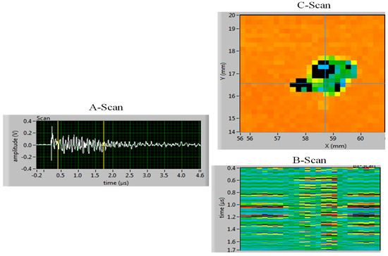 Figure 15 shows that the debond is on the back cladding. The “hash” between the yellow lines in the A-scan is caused by UT ringing in the Al ligament formed by the debond. It is interesting to note that there is an indent where the debond occurred. We assume that this indentation shown in