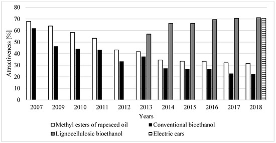 The attractiveness of the sector of conventional biofuels, that is, methyl esters and bioethanol, has been analysed by many authors starting from 2007, and the results have been published in many articles [63,64,65,66]. Since 2013, the sector of lignocellulosic bioethanol was also assessed. In 2018, the scope of research was extended to include the sector of electric cars, and the results obtained were compared to those for the previous years in Figure 2.