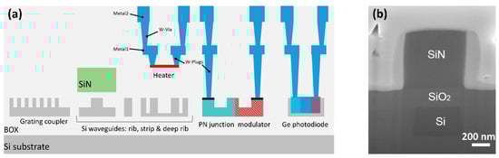 Silicon photonics offers cost-effective and scalable solutions to a wide range of mature and emerging applications, such as telecommunication and datacom [,,], high-performance computing [], quantum communications and computation [,,], LIDAR (Light Detection And Ranging) [,,,], and nonlinear optics [,,]. In the last few years, silicon platforms have been enriched with complementary functionalities by integrating other optically active materials into the platform, while preserving the complementary metal-oxide-semiconductor (CMOS) compatibility. For example, we have reported the heterogeneous integration of III-V materials in Si platforms to realize III-V/Si hybrid laser sources [,,]. In addition, fast and efficient photodiodes can be obtained by growing Ge on Si []. It is then possible to combine the optoelectronic properties of these materials with high-speed and efficient Si modulators based on p-n junction [].
