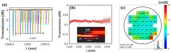 (a) SiN ring resonance shift against T. Each color represents a measurement at a different temperature, from 25 °C to 80 °C. The resonance shift with temperature allows to extract the SiN thermo-optic coefficient α = 1.7 × 10−5 K−1. (b) Measured spectrum of the Si-SiN transition insertion loss. Inset: side view of the transition with the optical mode from a BPM simulation. (c) Wafer mapping of the transition insertion loss (in mdB). Inset: histogram of the wafer level insertion loss. The median value is 0.09 dB and the standard deviation is 0.01 dB.