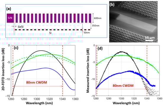 It can be generally said that, for a given fiber type, a wider transmission band will result from a reduction in the effective index of the grating. While using materials with lower optical indices (such as SiN) to make fiber grating couplers tends to lead to wider transmission spectra, these gains are often associated with increased insertion losses. The inclusion of the SiN layer in this process allowed us to compare Si, SiN and hybrid SiN/Si SPGCs for their use in CWDM applications and device testing. The standard Si SPGC is a partially etched (300/150 nm nominal Si thicknesses), apodised design. The SiN grating design is based on fully etched SiN lines and trenches, optimized for a peak transmission at 1310 nm. The BOX thickness is 2 µm, but with the SiN being 200 nm above the Si layer, the total substrate-SiN distance is 2.5 µm. Figure 4a,b shows a hybrid SiN/Si design as introduced by Sacher et al. []. The SiN waveguide is connected to a primary, fully etched grating, beneath which is a secondary Si grating. The secondary Si grating, while having the same period, may be displaced with respect to the primary SiN grating (denoted as ΔxSi in Figure 4a, which allows a lithographic control over the grating directionality. This is not possible with a conventional single-layer grating, where the directionality is fixed by the thickness of the etched and unetched layer thicknesses. As was also demonstrated in [], allowing the fiber angle to be a free parameter allows further optimization of the grating directionality for a particular BOX thickness. In this study, however, the fiber angle was fixed to the typical standard value of 8° (in the SiO2 cladding) to allow compatibility with standard test and packaging procedures.