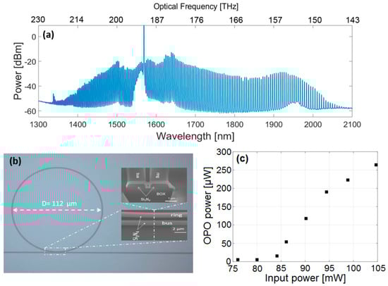 The optical spectrum out of an annealing-free silicon-nitride-on-insulator micro-ring with a 56 µm radius is shown in Figure 5a. An optical picture of the ring is shown in Figure 5b. The cross-section dimensions (1.5 µm-wide × 740 nm-thick) of the ring waveguide ensure that GVD is anomalous at the 1569 nm pump wavelength. The loaded quality factor of the microring—which is separated by a 350 nm gap from the bus waveguide—exceeds 580,000. A relatively smooth native line spacing (~406 GHz) frequency comb spanning about 800 nm between 1300 nm and 2100 nm is obtained for ~1 W continuous-wave power (Pin) coupled in the bus waveguide (i.e., a value comparable to that required for similar rings in high-temperature annealed Si3N4 []. The Optical parametric Oscillator (OPO) threshold power was measured to be around 83 mW (see Figure 5c).