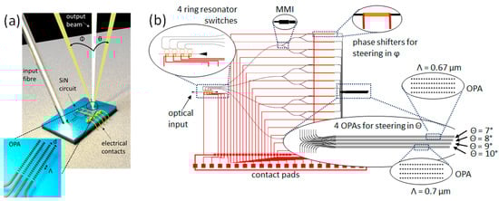 Over the last decade, optical phased arrays (OPAs) have attracted significant attention due to their potential use in a broad range of advanced technological applications, including light detection and ranging (LIDAR), free space communication, and holographic displays []. This interest arises from the advantage that OPAs enable non-mechanical, arbitrary beam shaping and steering. Furthermore, it has been shown that OPAs can be implemented using integrated photonics, creating a path for miniaturized low-cost systems [,,]. OPA integration has been explored on various photonic platforms, of which silicon photonics is particularly attractive due to its CMOS compatibility and high refractive index contrast []. Advanced OPA circuits have been demonstrated at telecommunications wavelengths using silicon, such as a fully integrated device for two-dimensional beam scanning [], ultra-low divergence beams [,], and coherent LIDAR circuits [,]. However, the use of silicon provides some limitations in terms of wavelength transparency and maximum optical power. Here, the use of (SiN) presents a host of interesting possibilities, as outlined in the following.