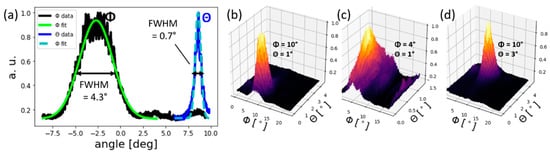 (a) Cross-sections in ϕ and θ of the main lobe to determine the FWHM. (b–d) Examples of output beam intensity profiles showing beam steering in two dimensions.