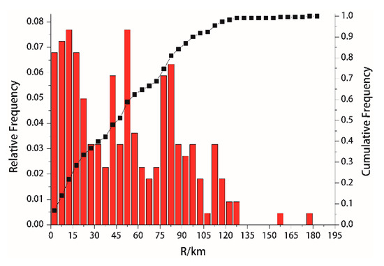 In order to investigate the characterization of the multi-pulse near-fault seismic motion, the author’s method was applied to the 221 sets records for the Chi-Chi event collected from the Strong-Motion Virtual Data Center. Fifty-three sets of records qualified as pulse-like motions with a varied number of dominant pulses. Figure 13 shows the distribution of the closest distance-to-fault for the 53 sets pulse-like strong ground motions. The cumulative frequency for the records whose closest distance-to-fault was within 30 km was 92.45%, which took up the majority of the qualified records. This result agrees well with the commonly adopted engineering assumption that the near-fault earthquake motions are mainly located within 30 km from the epicenter. Nevertheless, it should be noted that there are still many records located within 30 km from the epicenter that do not qualify as pulse-like, such as the records shown in Figure 5c,d. Thus, the commonly used engineering assumption of 30 km is not suited for the classification of a specific set of strong ground motion.