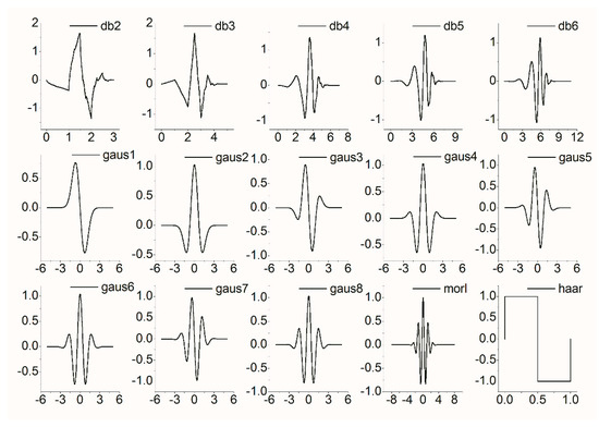 Regarding the typical profile of near-fault earthquake motions, the mother wavelets shown in Figure 2 were used in this paper as the candidate mother wavelets. The repository was composed of 15 types of mother wavelet, including the Haar wavelet, the Gaussian wavelet family from orders 1 to 8, the Daubechies wavelet family from orders 2 to 6, and the Morlet wavelet. These mother wavelets were adequate for the majority of pulse-like seismic signals.