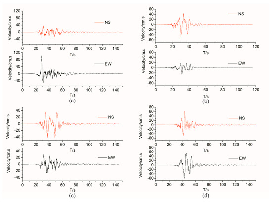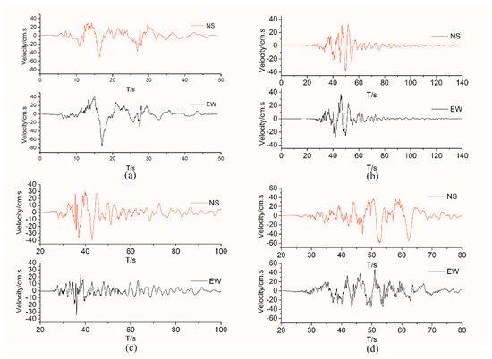 The recorded horizontal velocity time–histories: (a) station TCU101, (b) station TCU131, (c) station CHY029, and (d) station TCU070.