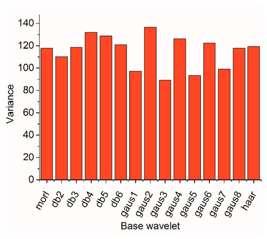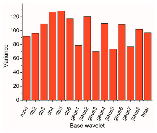 The variance value for all candidate mother wavelets in the repository by the adaptive wavelet selection procedure.