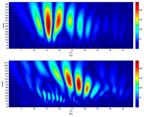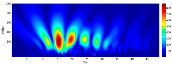 In order to identify the dominant pulse components embedded in , it was projected by CWT into the time–frequency plane by iteration pattern. The signal length of was 49 s. The y-axis was the transient frequency of the signal converted from the central frequency of the mother wavelet, the scale value, and the sampling frequency.