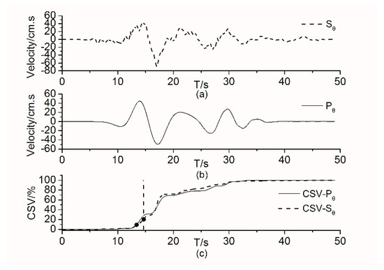 The early arrival of pulse energy by the CSV curves for the signals at station TCU101, (a) , (b), and (c) CSV curves for signal and .