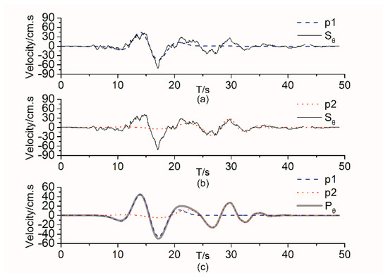 The strong ground motion may contain single or multiple pulse-like components featured by the long period and large velocity amplitude. For example, the recorded horizontal seismic signals at station TCU075 during the Chi-Chi event shown in Figure 4a, are representative of the single one pulse waveform. Its closest distance-to-fault was 3.4 km. The closest distance-to-fault for seismic station NSY, TCU060, and TCU128 were 9.1 km, 8.1 km, and 9.1 km, respectively. The multiple pulse waveform can be easily spotted in the recorded horizontal seismic signals as shown in Figure 4b–d. Thus, the dominant pulse-like components indeed exist in the recorded seismic signals.