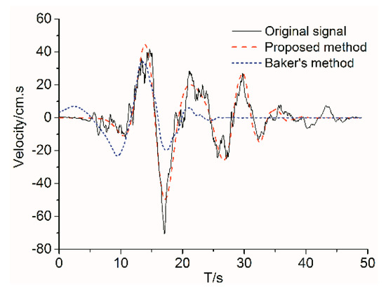 Figure 11 shows comparison of the extracted signal by both the author’s and Baker’s methods [1]. The signal extracted by the author’s method captured all the dominant pulses embedded in the signal . The signal extracted by Baker’s method only captured the first dominant pulse and failed to capture other dominant pulses after 20 s. Meanwhile, the large disagreement of the signal peak by Baker’s method at 17th second in Figure 11. This indicates that the author’s method made better representation compared with the Baker’s method, in the situation where the neighboring pulse components lay close to each other. This is because when large amplitude pulse components lie very close to each other, only one pulse is extracted by the Baker’s method, but several large wavelet coefficients are extracted by the author’s method.