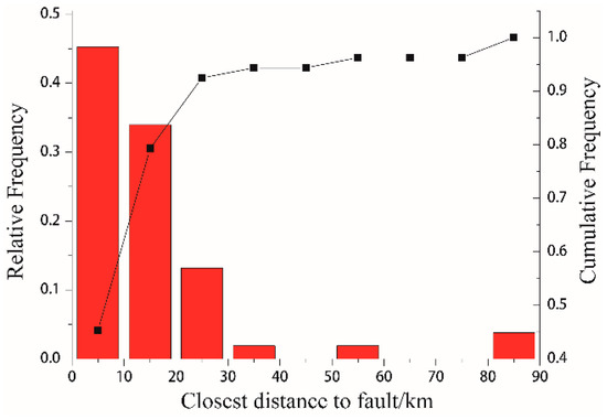 The relative frequency distribution of the closest distance-to-fault for all the 221 sets of seismic signals in the Chi-Chi event collected from the virtual data center (VDC).
