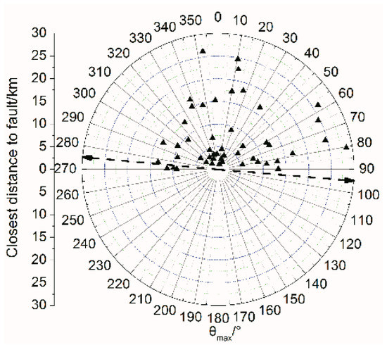 For near-fault earthquake motions, the largest pulse energy theoretically lies in the direction normal to the strike line [7]. The strike angle is 5° for the Chi-Chi event, namely the horizontal direction corresponding to the largest pulse energy in the direction of 95°/275° for the Chi-Chi event. The identified directions containing the largest pulse energy are plotted in Figure 14 to illustrate the relationship between and the closest distance-to-fault. In the figure, the theta axis is the value of the parameter , the radius axis for the closest distance-to-fault is limited to 30 km to facilitate the comparison with the theoretical direction. The dashed line represents the direction that is perpendicular to the strike of the earthquake event. These data show that there are some seismic motions existing in the directions that are deviated from the dashed line, which indicate that the pulse-like seismic motions were not limited to the direction normal to the fault, other directions that were not perpendicular to the fault may still contain prominent pulse-like motions. Figure 14 also shows that the horizontal direction was not limited to the EW/NS direction. Thirty-three set records were located within the range between , which took up 62.26% of the total number of the qualified pulse-like earthquake motions. Only 9.43% of the qualified earthquake motions lay in the direction with an error smaller than 10° with respect to the direction normal to the strike. This meant that the majority of horizontal directions containing the largest pulse energy did not coincide with the EW/NS direction at the seismic station for the Chi-Chi event. The use of single one components recorded at the seismic station (EW/NS) may underestimate the energy level of the input seismic signal. The varied relative orientation of the engineering structure with respect to the identified may impose a different level of seismic energy on the structure.