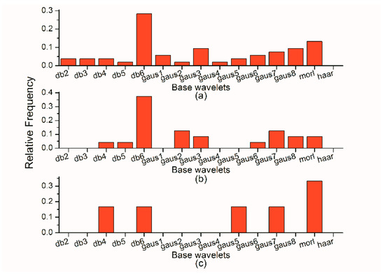 The relative frequency distribution for the occurrence of the mother wavelets in the 53 sets qualified earthquake motions (a) Wn1, (b) Wn2, and (c) Wn3.