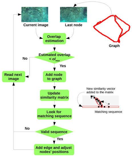 where k is the index of the next image in the sequence after image was added to the graph. This way, the rigid transformation is more likely to be correctly estimated as the displacement between consecutive images and is smaller than between the last keyframe and the current image . Then, if the overlap between and is less than the maximum overlap , and its associated visual features are used to created a node . Otherwise, image is not added to the graph, but its rigid transformation is preserved to estimate the transformation from the next image. The position for the new added node is obtained from the rigid transformation: