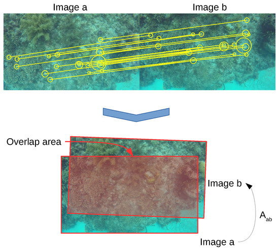 Example of the overlap calculation. Given two images and , the visual features between both images are matched. From those matches, a rigid transformation is obtained. After that, we can calculate the intersection between both frames and its area.